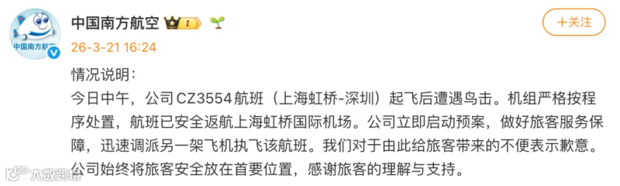 今日中午,公司CZ3554航班(上海虹桥-深圳)起飞后遭遇鸟击。机组严格按程序处置,航班已安全返航上海虹桥国际机场。公司立即启动预案,做好旅客服务保障,迅速调派另一架飞机执飞该航班。我们对于由此给旅客带来的不便表示歉意。公司始终将旅客安全放在首要位置,感谢旅客的理解与支持。