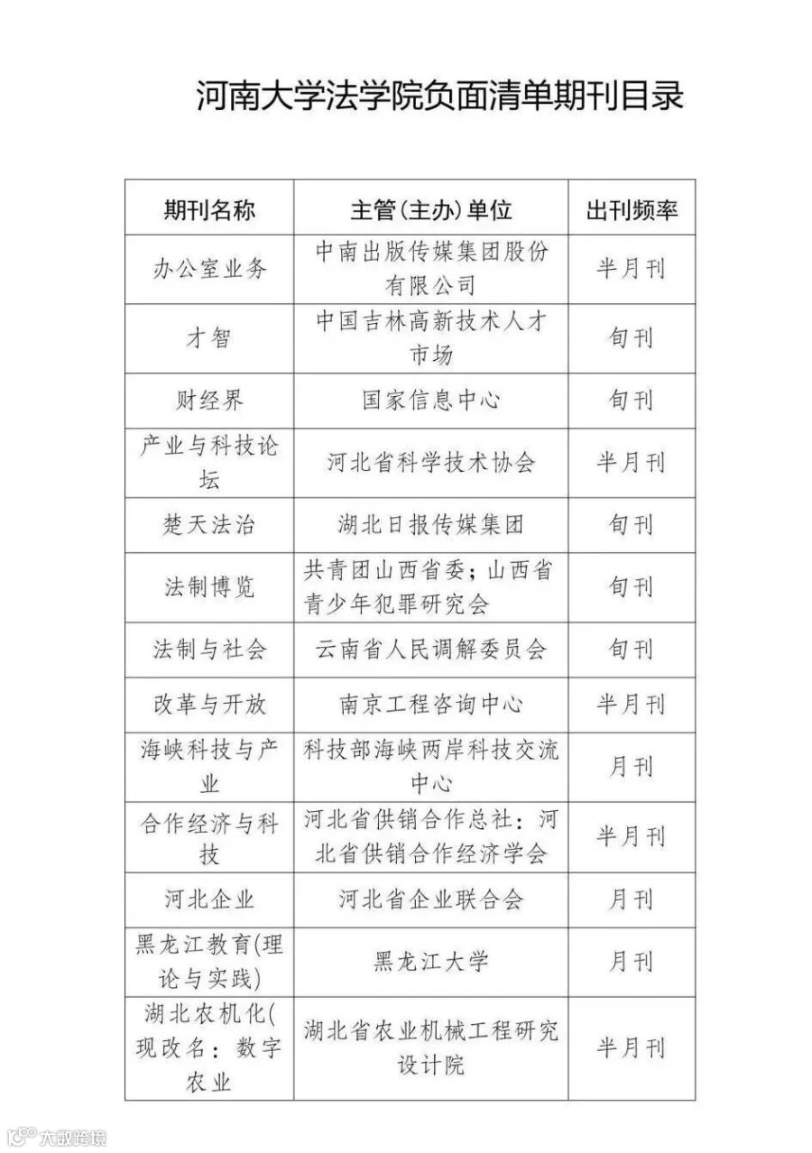 近日,河南大学法学院公布了《河南大学法学院负面清单期刊目录》,包括中南出版传媒集团股份有限公司主管(主办)的《办公室业务》等在内的143本期刊。事实上,这已经不是国内高校首次制订期刊“负面清单”,华东政法大学、中国科学技术大学、大连海洋大学、湘潭大学等高校早有制订清单的先例,高校对论文发表的从严管理已渐成趋势。