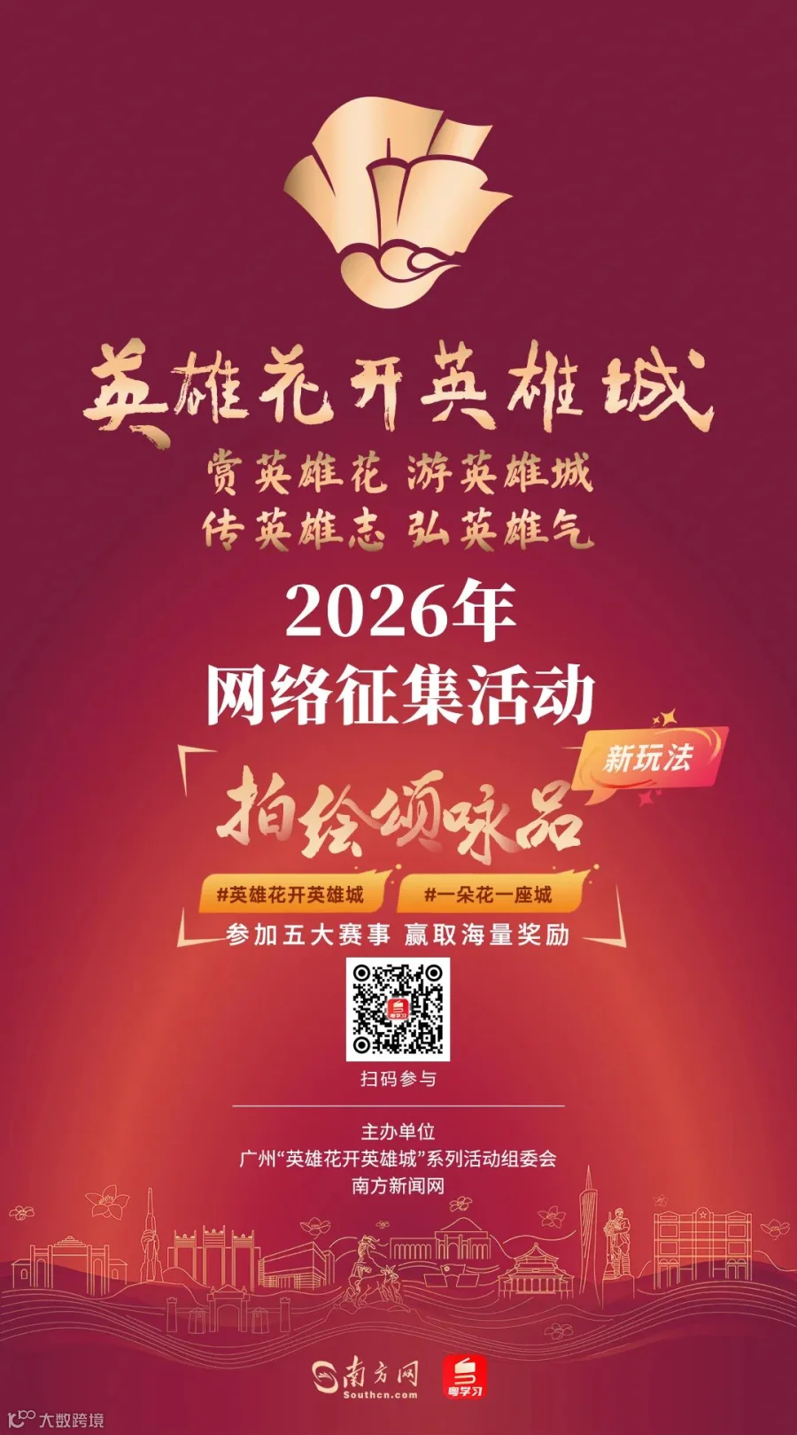 春临羊城,红棉绽放。作为广州的“英雄花”,这抹红色不仅装点着城市街巷,也串联起这座英雄城的革命记忆与时代风貌。即日起,由广州“英雄花开英雄城”系列活动组委会、南方新闻网主办的“英雄花开英雄城”2026年网络征集活动正式上线南方网、粤学习客户端!延续往年全民热度,本届活动在“拍、绘、颂、咏、品”五大征集形式的基础上全面升级,在抖音、微信视频号和小红书三个平台新增#英雄花开英雄城 #一朵花一座城话题新玩法,邀请市民网友用镜头、画笔、歌声和文字,记录自己眼中的英雄花和英雄城。活动还增设线下打卡、话题互动等环节,邀请大家以更丰富的视角和创意,解锁红棉与广州的红色故事。
