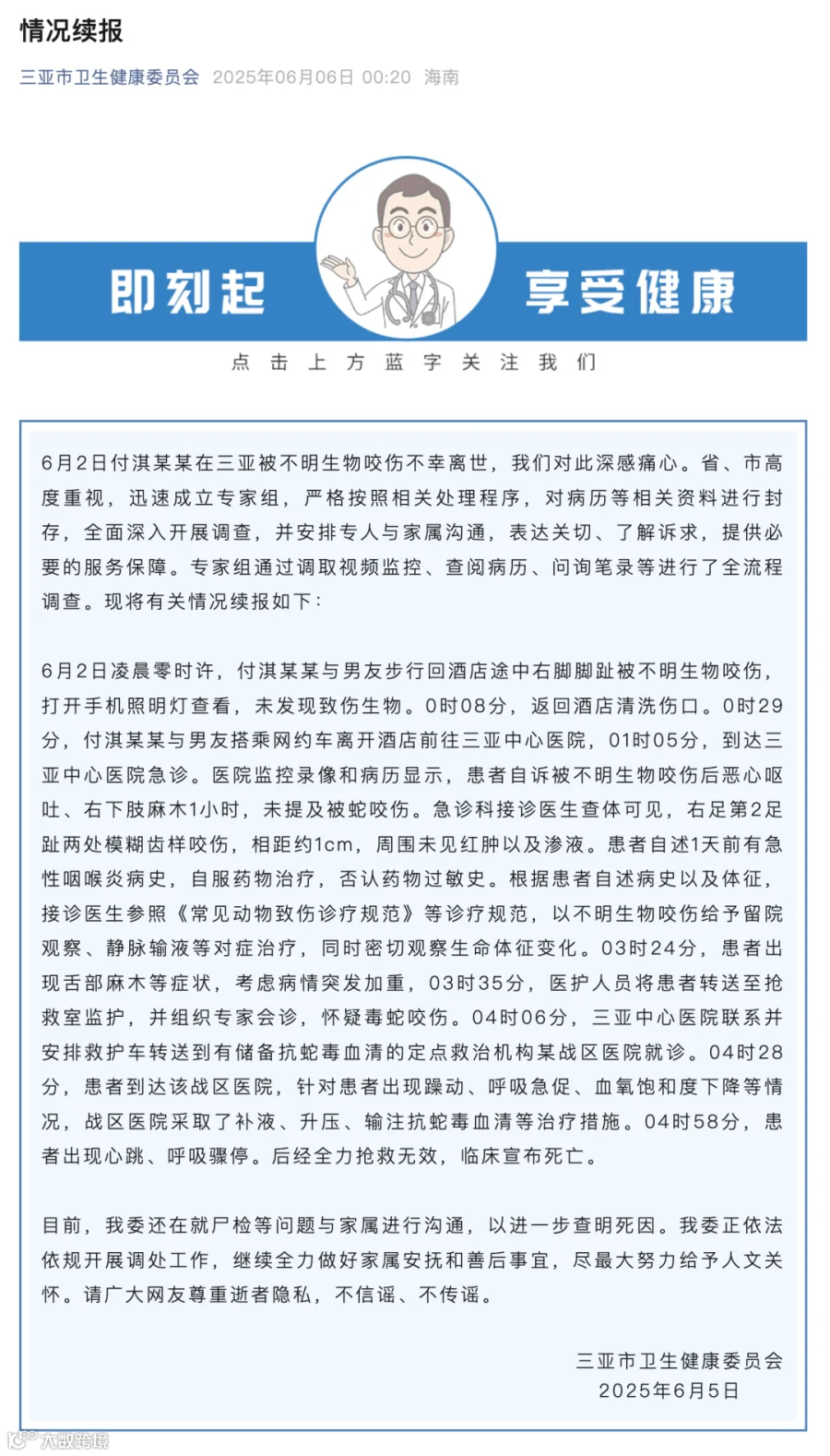 6月2日付淇某某在三亚被不明生物咬伤不幸离世,我们对此深感痛心。省、市高度重视,迅速成立专家组,严格按照相关处理程序,对病历等相关资料进行封存,全面深入开展调查,并安排专人与家属沟通,表达关切、了解诉求,提供必要的服务保障。专家组通过调取视频监控、查阅病历、问询笔录等进行了全流程调查。现将有关情况续报如下: