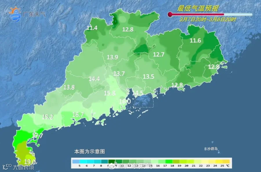7日,广东大部晴间多云。最低气温:粤北市县9~12℃,雷州半岛16~20℃,其余大部市县13~16℃。