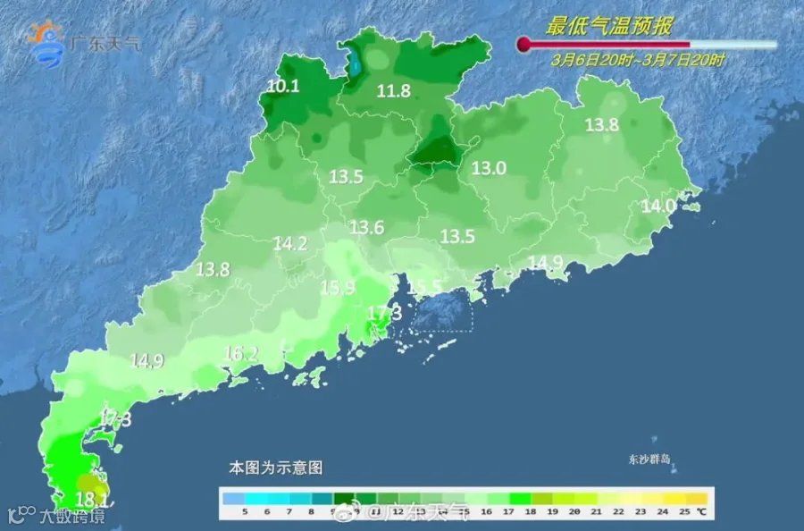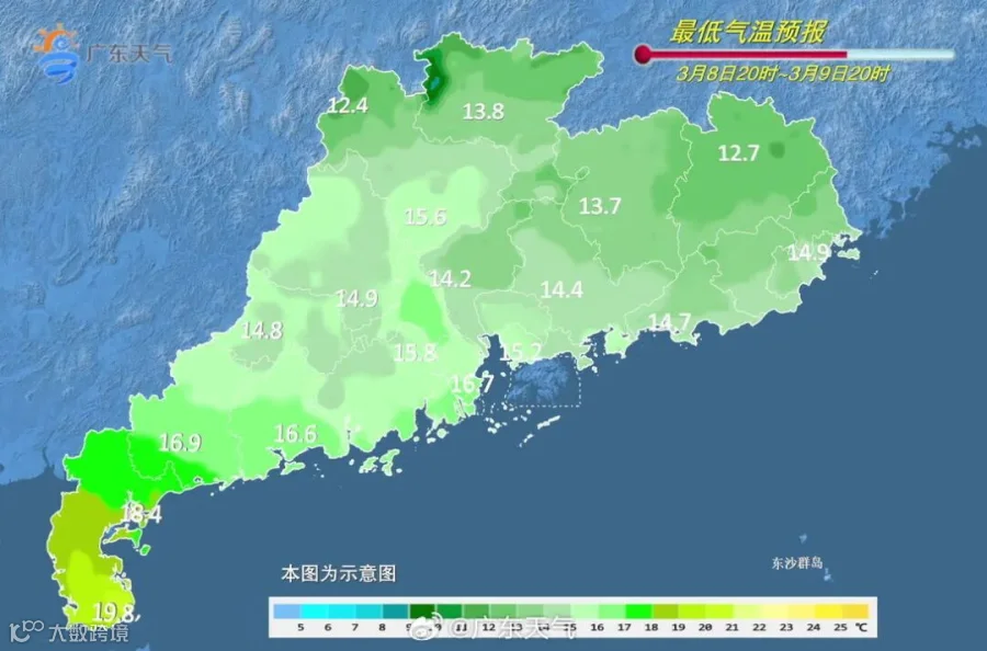 8日,广东大部晴到多云,西部市县早晚有轻雾。最低气温:粤北、粤东的北部市县10~13℃,雷州半岛16~20℃,其余大部市县13~16℃。