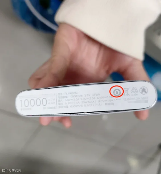 画圈处为充电宝内电池可循环使用5年的年限标识。该充电宝已使用6年,尾部出现鼓包,属超年限使用。