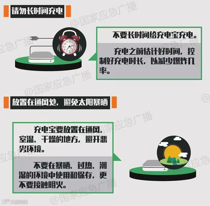充电时,如果将充电宝放在被子、盒子等不利于散热的环境,或将充电宝置于太阳下等高温区域,都有可能引发充电宝的自燃爆炸。充电宝平时应存放在温度适中、干燥的地方,防止暴晒,其最佳使用温度是0~40℃。