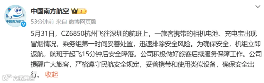 今天(5月31日)13时许,@中国南方航空 发布通报: