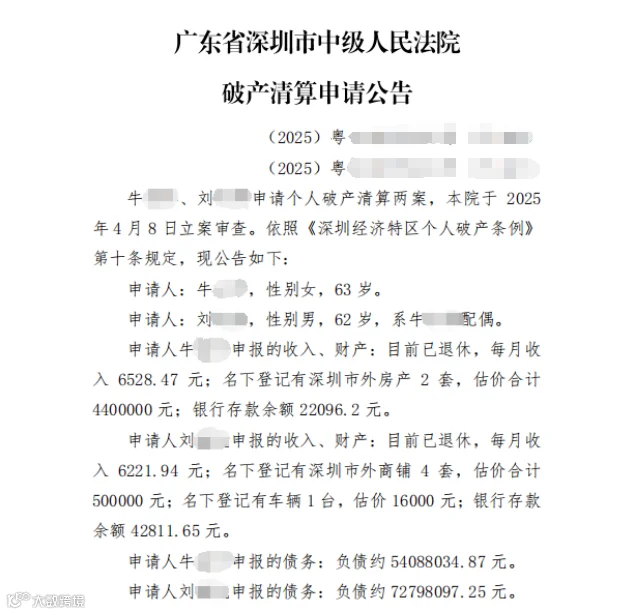 据深圳市中级人民法院近日发布的一起破产清算申请公告,一对月收入为1.2万元的退休夫妻,申报了超过1.2亿元的债务。