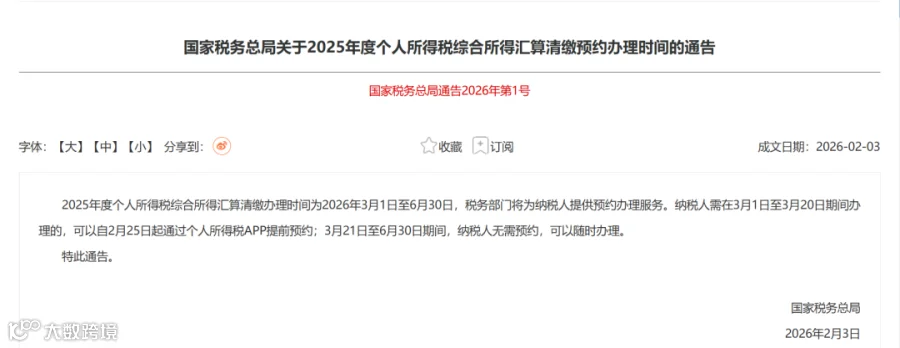 通告明确,2025年度个人所得税综合所得汇算清缴办理时间为2026年3月1日至6月30日,税务部门将为纳税人提供预约办理服务。