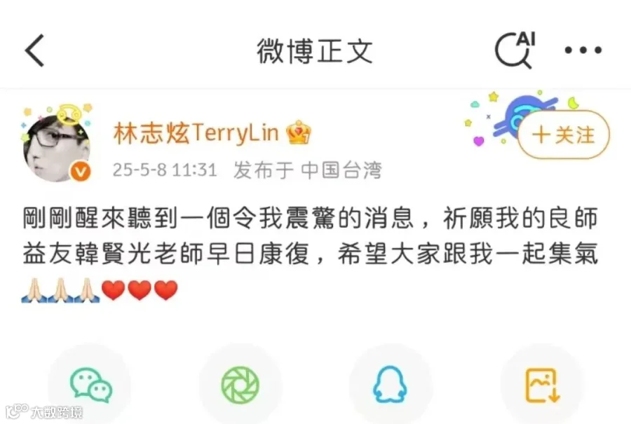 5月8日,歌手林志炫在微博发文称:“刚刚醒来听到一个令我震惊的消息,祈愿我的良师益友韩贤光老师早日康复。”林志炫的金曲《单身情歌》《离人》便是由韩贤光编曲。