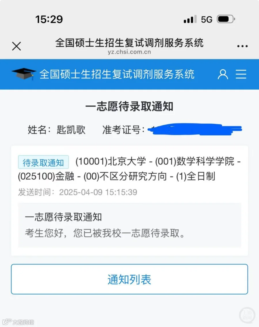 26日,记者登录北大数院官网,果然发现发布于今年4月3日的《数学科学学院2025年硕士招生拟录取公示名单》,其公示