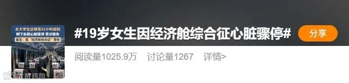 “经济舱综合征”又称“机舱内血栓形成症”,由于长期在狭窄空间、空气湿度低环境内不能活动,双下肢静脉血液回流缓慢、淤滞,形成下肢深静脉血栓,就是我们所说的血块,患者下飞机一活动,血栓脱落,随血液回流到心脏,继而又达到肺动脉,引起“肺栓塞”,使肺脏缺血、缺氧引起胸痛、气短、咯血,严重时会猝死。