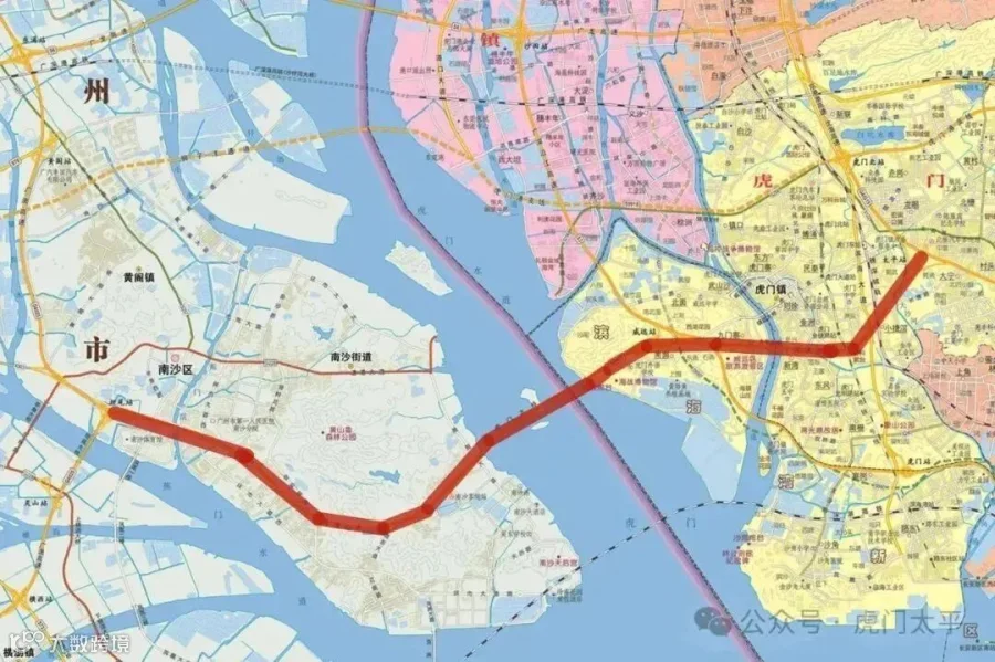 市南沙区和东莞市虎门镇,全长约16公里,双向6车道。主桥长4.6公里,主跨为888米的钢箱梁悬索桥。