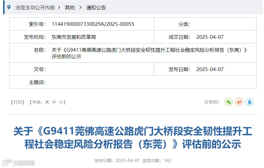 根据《交通运输部关于进一步提升公路防灾减灾能力的指导意见》(交公路发〔2024〕76号),计划开展莞佛高速公路虎门大桥段安全韧性提升工作,从而提升虎门大桥段安全韧性、恢复通道交通功能、保证结构安全耐久。