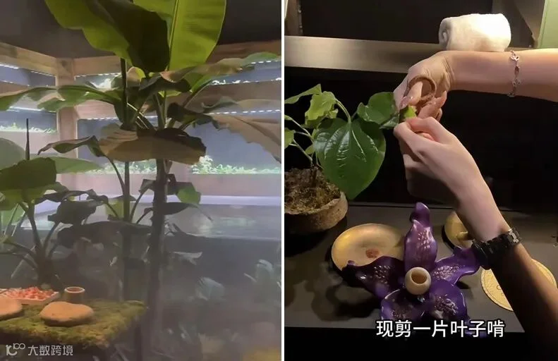 视频显示,餐厅绿植环绕、水雾弥漫,人仿佛置身于热带雨林中。客人进门后,首先体验的项目是啃叶子,随后还要穿越几个房间,参观食材展示室、蔬菜温室等。
