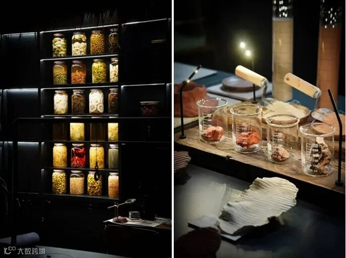 边走边吃了几道料理后,客人们才能正式坐上餐桌。菜品通过滑动式桌板传递到每个人面前,视频显示当天的菜品包括一块蜂蜜味的冰、一碗模拟寄生花腐臭味道的糊糊,以及竹虫、酸蚂蚁、野鸡等食物。