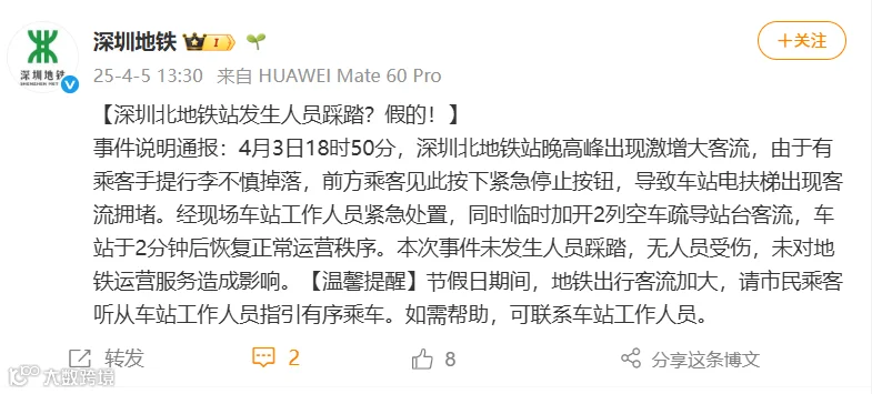 据媒体此前报道,5日上午,深圳北站地铁站工作人员表示,网传信息不属实,深圳北站地铁站并未出现踩踏事故和乘客受伤等情况,目前深圳地铁在正常营运中。针对视频中乘客爆满的情况,该工作人员表示:“这属于节假日期间的正常客流,我们都有提前安排人去引导秩序的。”