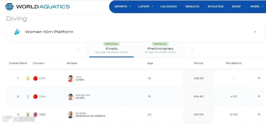 陈芋汐以419.35分的成绩夺得冠军,全红婵以414.40分的成绩摘得银牌,英国选手以337.70分的成绩排名第三。