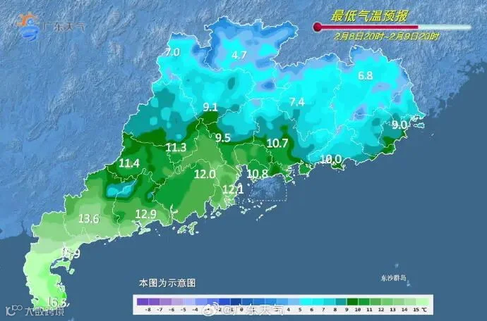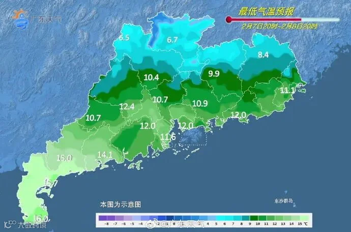 广东省气象台预计,2月7日冷空气继续南下影响广东,部分市县伴有小雨,气温继续下降,过程最低气温出现在2月8日或9日早晨,粤北部分市县有5℃以下低温,高海拔山区1~3℃,局部有霜(冰)冻,广州过程最低气温9℃左右,2月10日起气温逐渐回升。