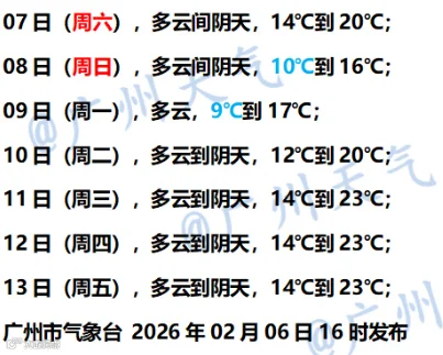 广州市气象台预计,中等强度冷空气2月6日夜间至9日影响广州,广州以多云间阴天为主,日平均气温下降5~8℃,陆地阵风将加大至4~6级,港区和高地阵风6~8级。气温逐日下降,2月9日早晨出现此次降温过程最低气温:北部6~8℃,中部9~10℃,南部11~12℃。2月10日后以多云到阴天为主,气温逐渐回升。