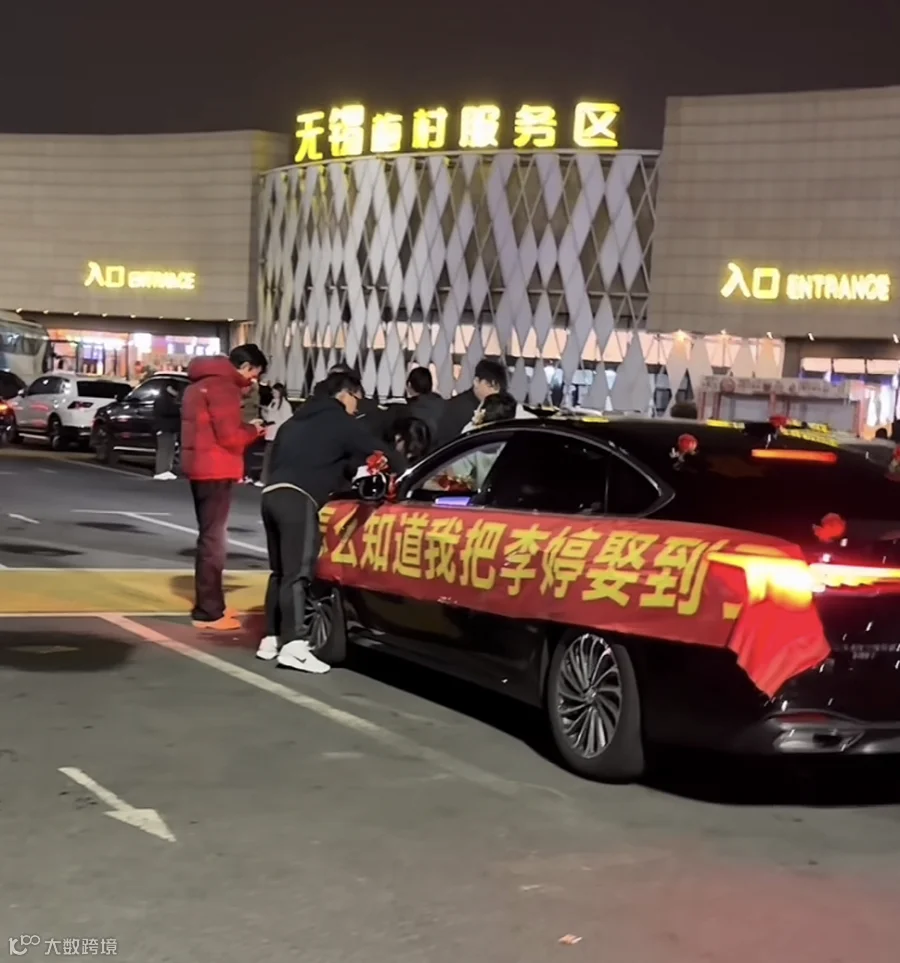 董先生说,他从上海返乡过年,在高速上看到一辆婚车,贴着“你怎么知道我把李婷娶到了”的醒目横幅。因路途较远,婚车仅有一辆,新郎自驾载着新娘。多人摇下车窗和新郎新娘打招呼送祝福,多辆陌生车加入婚车交替陪跑,组成了一条临时车队,新人也礼貌挥手向大家致谢。