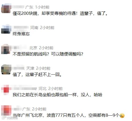 在评论区,有不少人称,以前也乘坐过该航班,体验过一个人独享一架飞机的“包机”服务,下机前还特地跟机组人员合了影。
