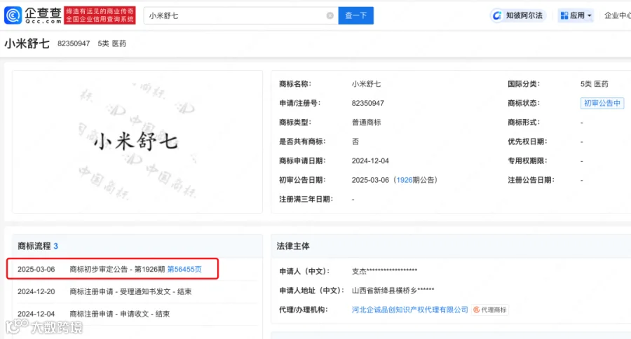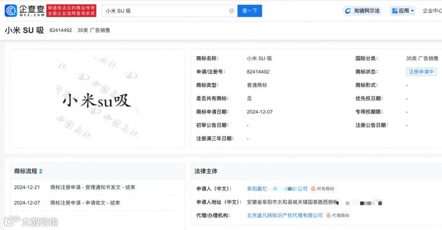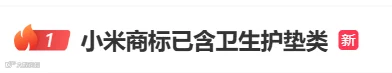 企查查APP查询发现,成都一塑料包装公司曾申请一枚“小米卫生巾”商标,目前为驳回待复审状态;自然人支某曾申请一枚“小米舒七”商标,该商标于今年3月6日发布初审公告;阜阳一传媒公司曾申请“小米 SU 吸”商标,国际分类为广告销售,状态为注册申请中。此外,还有多家公司申请“雷巾”等商标,状态均为注册申请中。