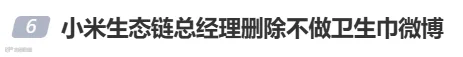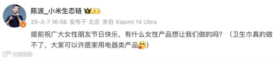 关于小米是否会生产卫生巾等产品。3月7日,小米生态链总经理陈波发文:“提前祝广大女性朋友节日快乐,有什么女性产品想让我们做的吗?卫生巾真的做不了,大家可以许愿家用电器类产品。” 评论区,网友纷纷提出建议:“化妆镜和母婴用品。”“洗脸仪、护眼仪都可以。”