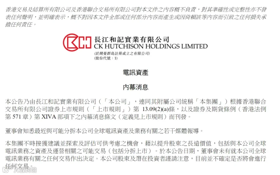 3月31日,李嘉诚旗下长江和记实业有限公司在港交所发布公告表示,董事会知悉最近与可能分拆本公司全球电讯资产及业务有关之若干媒体报道,于本公告日期(3月31日),董事会未有就本公司全球电讯业务有关之任何交易作出决定,目前并不确定是否将会进行任何交易。