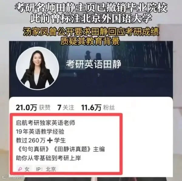 事件发酵十余日后,田静被曝悄然删除社交平台上的“北京外国语大学硕士”学历信息。这一举动加剧了公众对其教育背景真实性的怀疑。从成绩争议到学历隐身,田静的形象在公众心中逐渐崩塌,也让人们对考研辅导行业的信任产生了动摇。