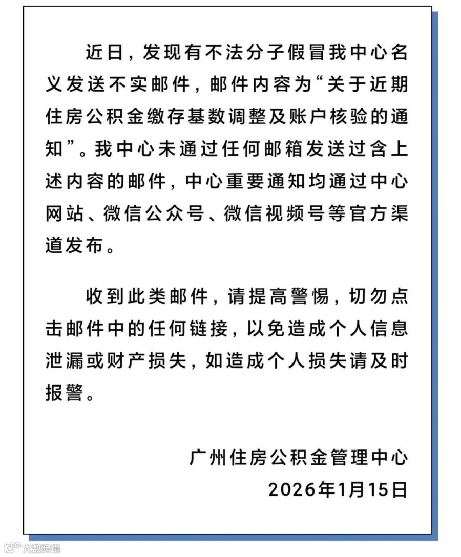 1月15日,记者从广州住房公积金管理中心获悉,近日,发现有不法分子假冒该中心名义发送不实邮件,邮件内容为“关于近期住房公积金缴存基数调整及账户核验的通知”。该信息不实。