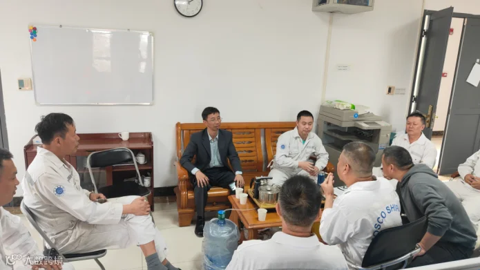 3月14日下午,船技工程纪委书记、工会主席蔡华建前往广州南沙龙穴造船基地,看望慰问广船国际半潜船监造组全体人员,代表公司向奋战在工作一线的同志们送上诚挚问候。蔡华建主席在听取监造组对近期生产工作和生活情况介绍后表示,南沙监造组长期奋战在船厂一线,以船东满意为目标,以三方“党建共建”为抓手,与船厂、船检一起不断突破船舶建造技术、工艺难关,做了大量工作也取得很好的成绩;后续要结合产品生产计划,与船厂等通力协作,攻坚克难、奋力抢抓产品在船坞的关键周期,高质量推进产品各阶段报验工作。