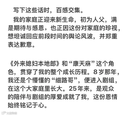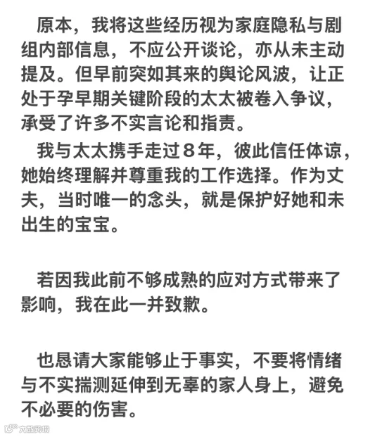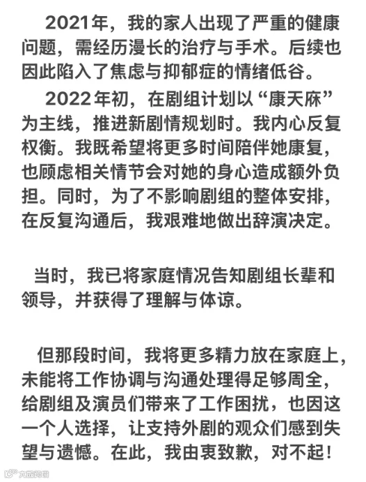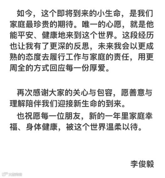 在回应长文中,李俊毅称,自己8岁那年进入剧组,并在这个大家庭里长大。2021年,其家人出现了严重的健康问题,需经历漫长的治疗与手术,后续也因此陷入了焦虑与抑郁症的情绪低谷。2022年初,在剧组计划以“康天庥”为主线,推进新剧情规划时,李俊毅称既希望将更多时间陪伴她康复,也顾虑相关情节会对她的身心造成额外负担。同时,为了不影响剧组的整体安排,在反复沟通后,艰难地做出辞演决定。李俊毅称,如今自己的家庭正迎来新生命,与太太携手走过8年,作为丈夫希望能保护好她和未出生的宝宝,并为此前不够成熟的应对方式带来的影响致歉。