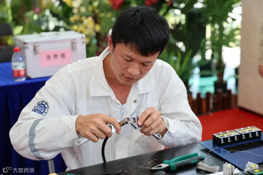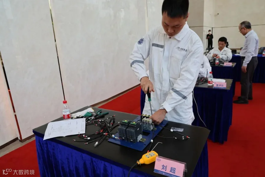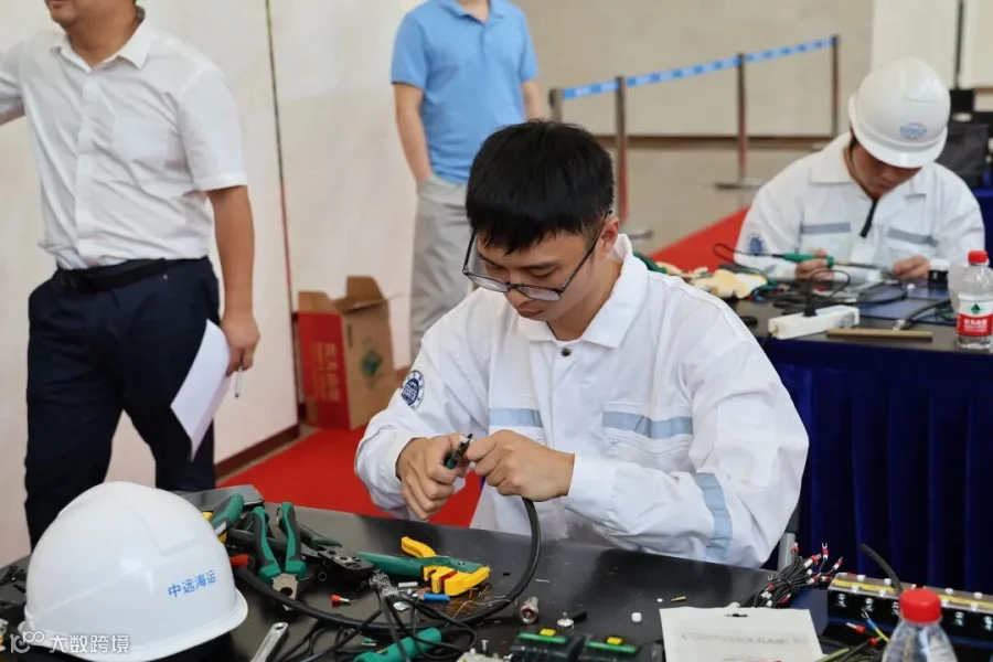 下午实操竞赛有两项。第一项是船用电子设备接线端子联接竞赛,考验选手对各式工具的掌握,对接线工艺的熟悉程度,对压线力度的把握以及高质量的焊接技术等。第二项是装配技能竞赛,选手们根据产品的原理图和安装图,把产品的所有零件组装成可以使用的成品。考验选手们看图能力、安装水平、布线工艺、工具使用、完成时间、装配质量等综合能力。