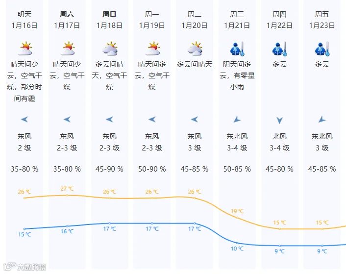 预计,16日至18日控制华南的冷高压趋于减弱,广东大部晴到多云,气温总体趋于回升,昼夜温差大,早晚寒凉,西部的部分市县早晚有(轻)雾。