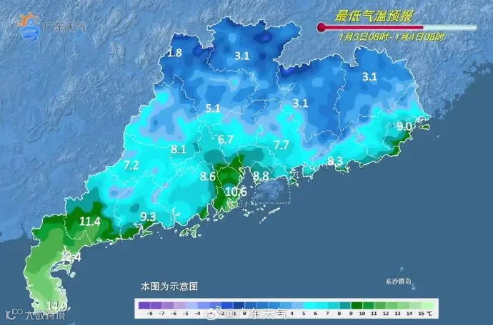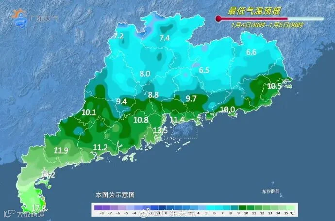 6日,全省大部晴到多云,昼夜温差大,早晚寒冷。最低气温:粤北、珠三角北部市县2~6℃,其中高海拔山区-1~1℃,有霜冻和局地冰冻,粤西沿海市县11~15℃,其余市县7~10℃。
