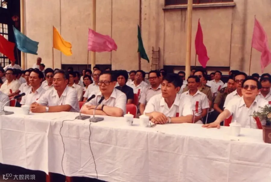 1986年7月27日,江泽民同志(前排右三)出席江南船厂为广州海运局“柳河”轮下水举行的命名典礼。