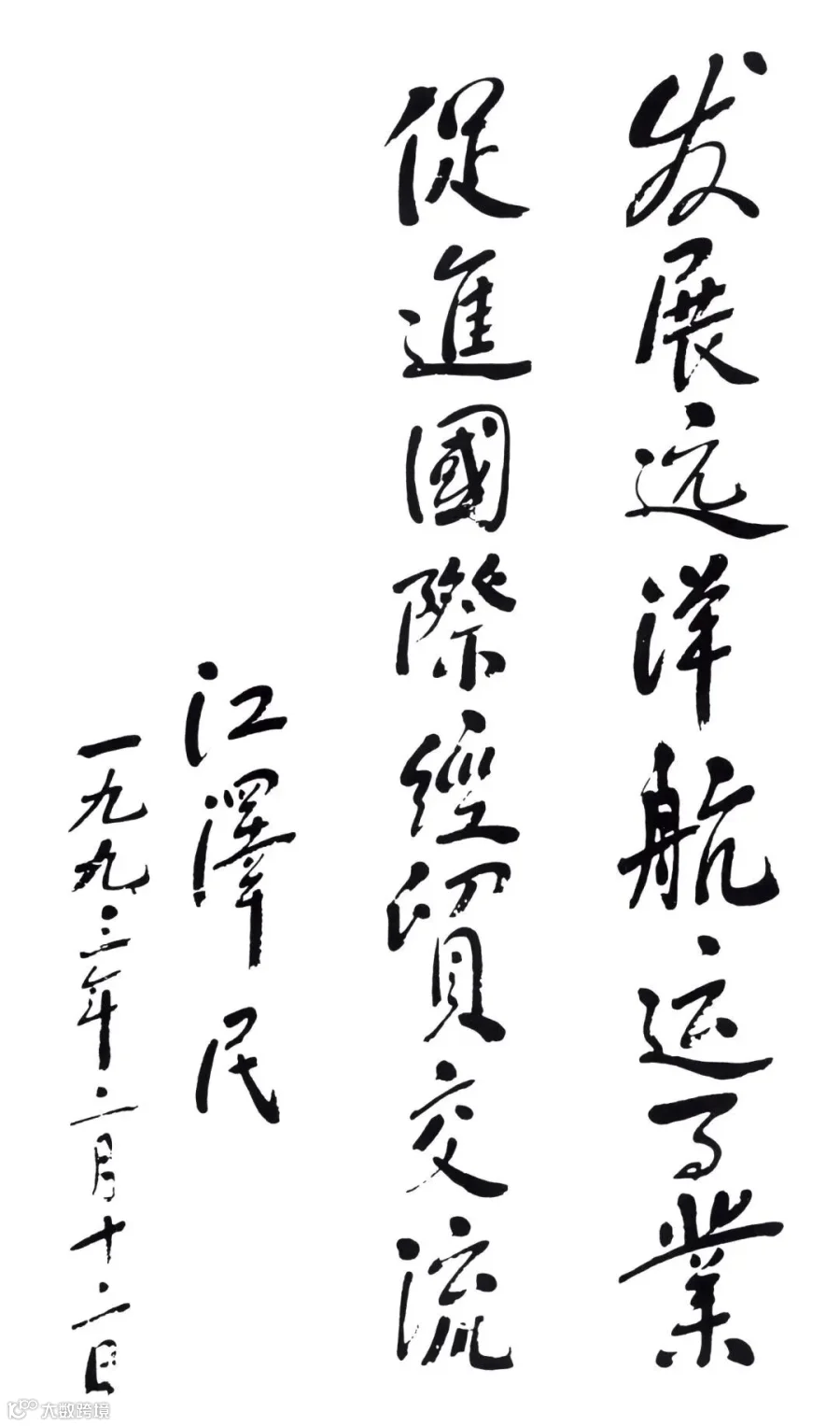 1993年2月12日,江泽民同志为中远集团成立题词:“发展远洋航运事业,促进国际经贸交流”。