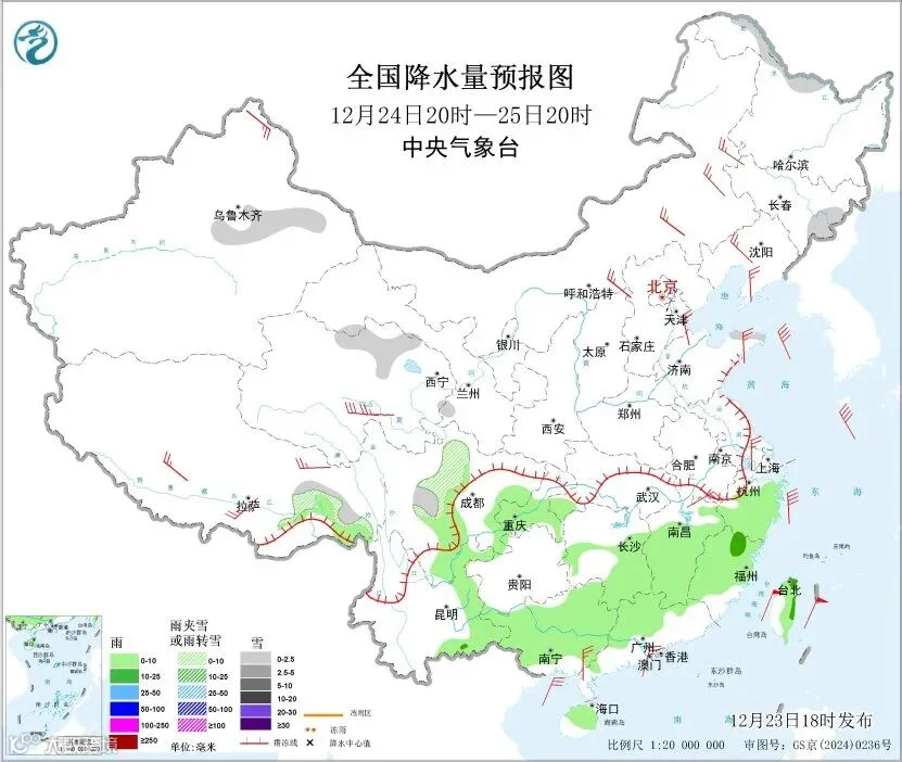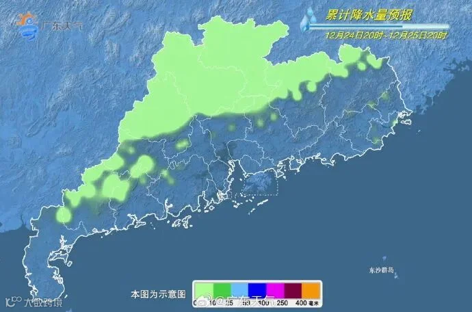 广东省气象台预计,12月24日早晨开始,中等强度冷空气影响广东西北部市县,当天傍晚到夜间影响中南部市县,并给广东带来弱降水,过程日气温下降4~7℃。