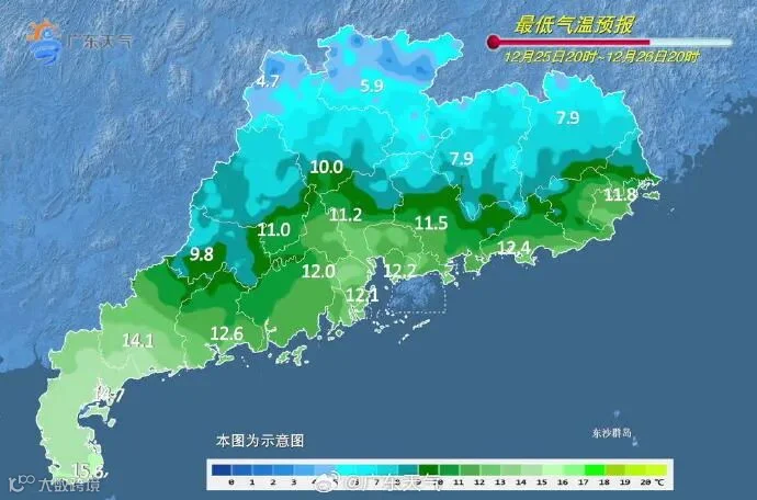 此次降温过程最低气温将出现在12月26日早晨前后,粤北部分市县将出现≤5℃的低温,高海拔山区局部有冰冻。12月25日—26日,广东海面东北风将加大到6~7级阵风8级。