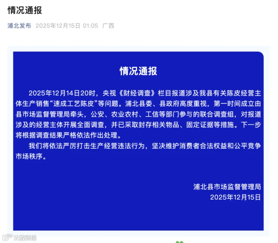 12月14日20时,央视《财经调查》栏目报道涉及我县有关陈皮经营主体生产销售“速成工艺陈皮”等问题。浦北县委、县政府高度重视,第一时间成立由县市场监督管理局牵头,公安、农业农村、工信等部门参与的联合调查组,对报道涉及的经营主体开展全面调查,并已采取封存相关物品、固定证据等措施。