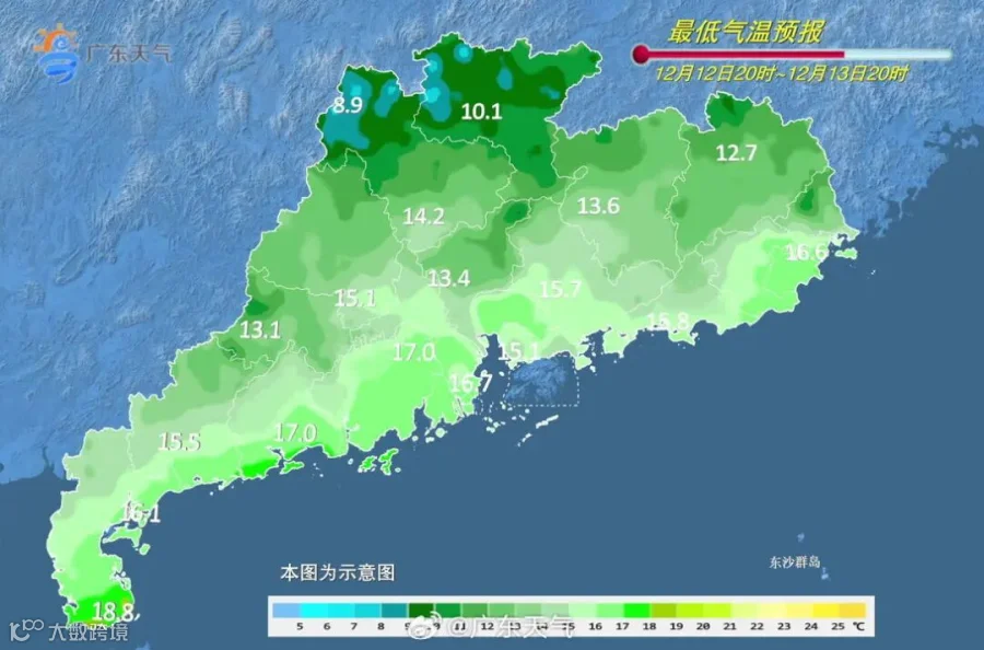 13日,广东大部市县阴天有小到中雨;气温缓慢持续下降,体感阴冷,白天最低气温将出现在傍晚前后:韶关、清远和肇庆市县8~11℃,南部市县15~18℃,其余市县12~15℃。