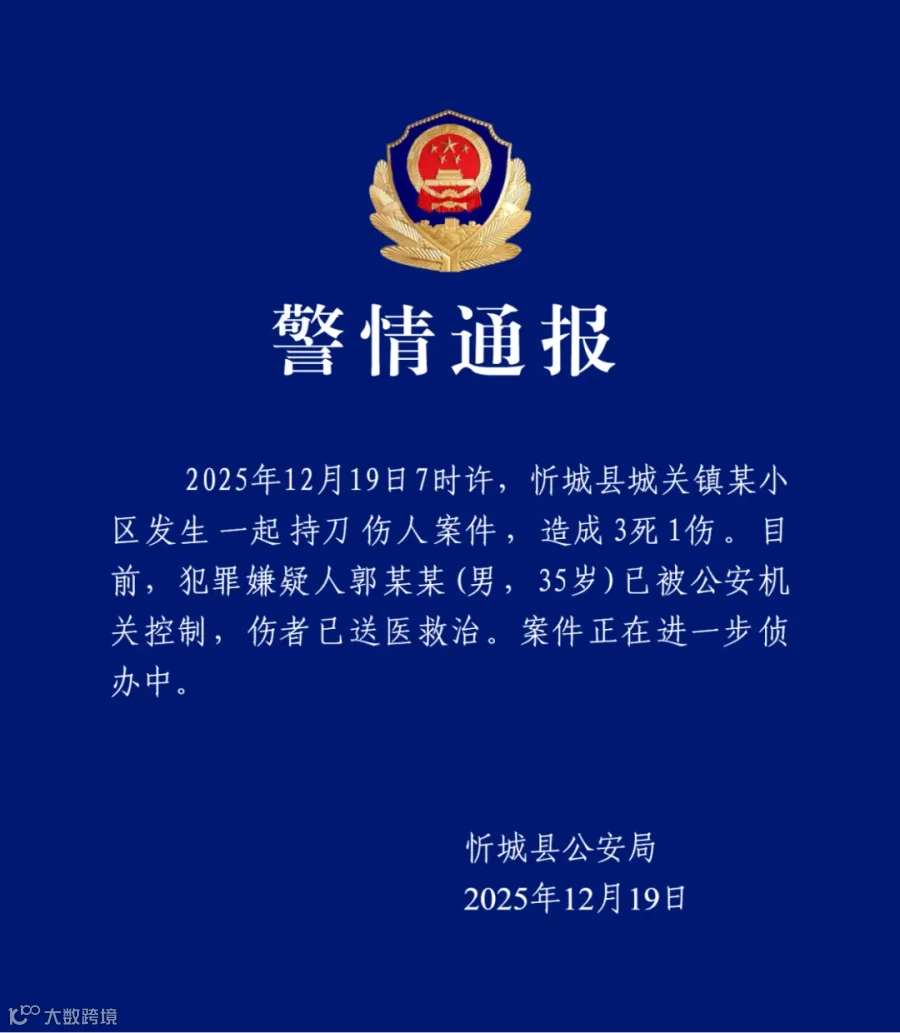 2025年12月19日7时许,忻城县城关镇某小区发生一起持刀伤人案件,造成3死1伤。
