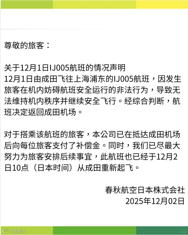 记者注意到,12月2日下午,春秋航空日本就此事发布情况说明称,“12月1日由成田飞往上海浦东的IJ005航班,因发生旅客在机内妨碍航班安全运行的非法行为,导致无法维持机内秩序并继续安全飞行。经综合判断,航班决定返回成田机场。”