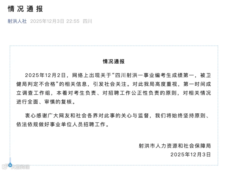 2025年12月2日,网络上出现关于“四川射洪一事业编考生成绩第一,被卫健局判定不合格”的相关信息,引发社会关注。对此我局高度重视,第一时间成立调查工作组,本着对考生负责、对招聘工作公正性负责的原则,对相关情况进行全面、审慎的复核。
