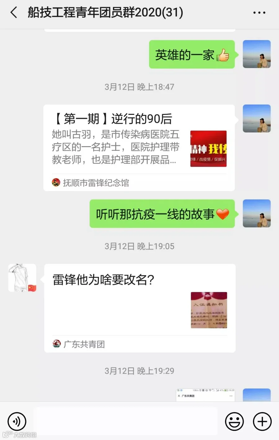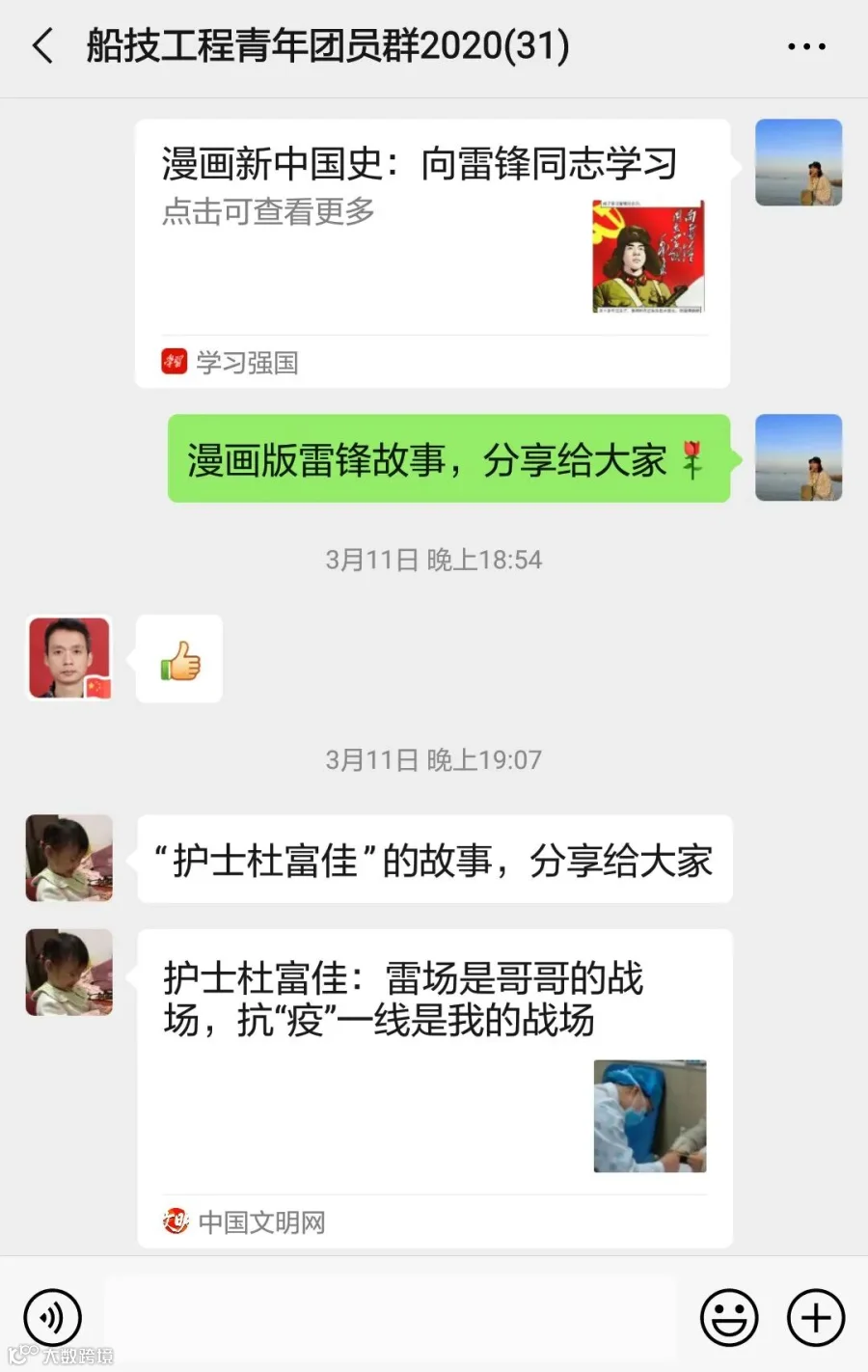 在团员青年微信群中,每天都会有大家推送的雷锋故事,转发分享的“雷锋”式典型人物事迹,特别是在疫情防控工作中驰援武汉的青年医护人员的先进事迹,大家踊跃发言、交流感想与思考。