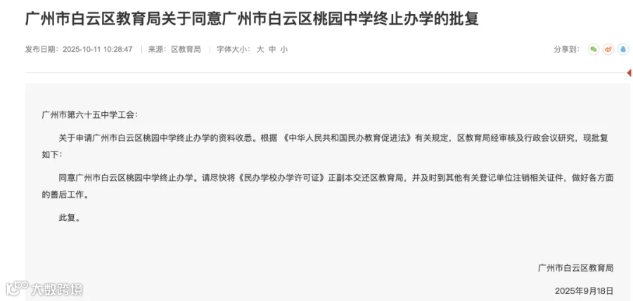 一是白云区教育局关于同意广州市白云区启润幼儿园终止办学的批复,二是白云区教育局关于同意广州市白云区桃园中学终止办学的批复。
