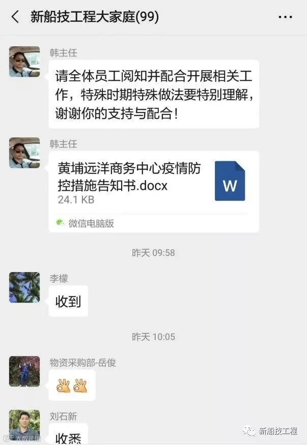 10日上午,公司党委书记马云涌、副总经理张卓雁前往各部门检查复工有关情况,包括防疫物资发放、经营生产等工作,要求全体员工在防疫期间要充分理解、配合公司疫情防控安排,要坚持做好自我的防护工作,传统业务部门要保持与船东船厂的紧密沟通,统筹跟进各项合同、工程项目进度,做到疫情防控与经营生产两不误。