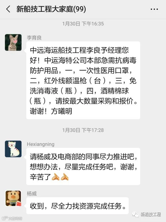 为每一位员工的健康保驾护航,做好“贤内助”,为中远海运特运、船技工程全体员工的顺利复工添砖加瓦。电商贸易部及物资采购部团队积极协助调集口罩、酒精、消毒液等用品,跟进购买发货。做好物资保障,为复工保驾护航,我们的团队一直行动中。