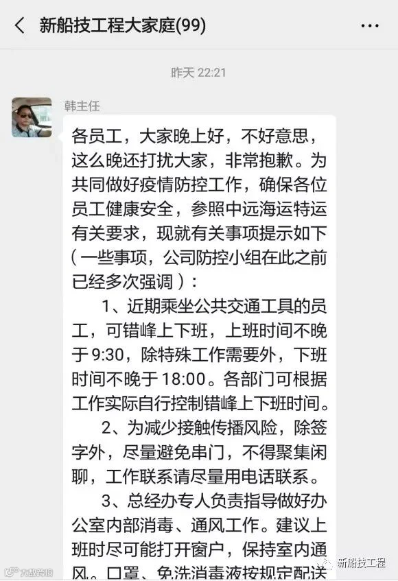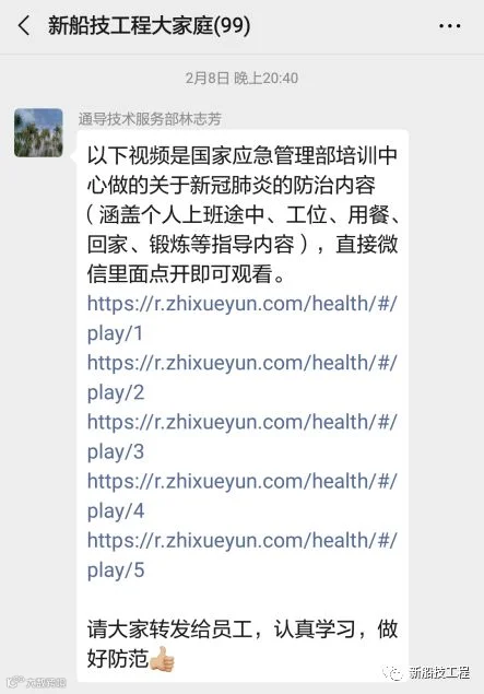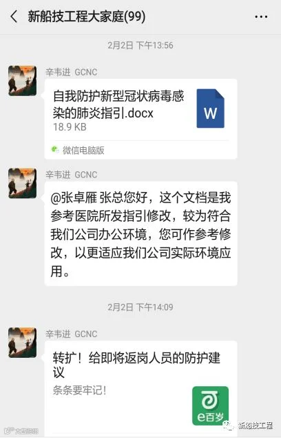疫情防控领导小组线上时刻叮咛,通过公司公众号、微信群等频繁分享各类防疫指南,不断提升员工自我防疫意识,引导员工科学防疫;线下同步指挥部署,1月30日召开党委(扩大)会议暨疫情防控专题会, 2月3日、2月5日在公司大门分别召开新型冠状病毒感染肺炎防控再部署工作会、新型冠状病毒感染肺炎防控紧急会议等,就抓细抓实疫情防控的落实工作进行了细致研究和精准部署,始终全力为船技工程的员工健康、安全生产保驾护航。