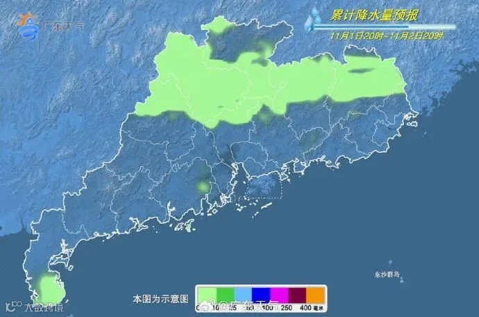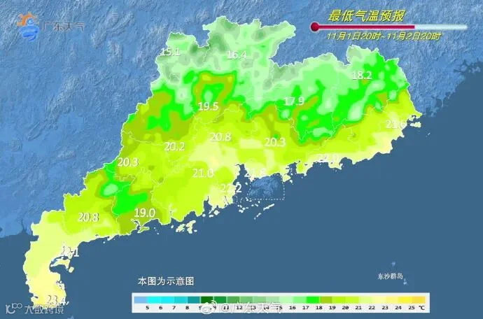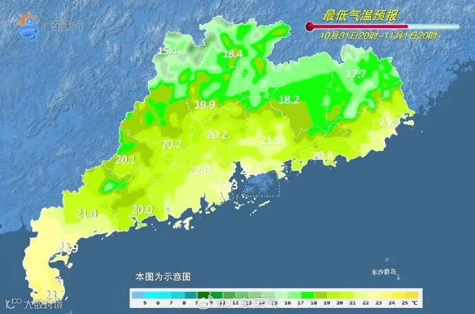 10月31日开始受弱冷空气持续补充扩散影响,各地气温逐日略有下降,11月1日-4日各地日平均气温下降3~6℃;粤北市县最低气温15℃~18℃,早晚体感清凉。