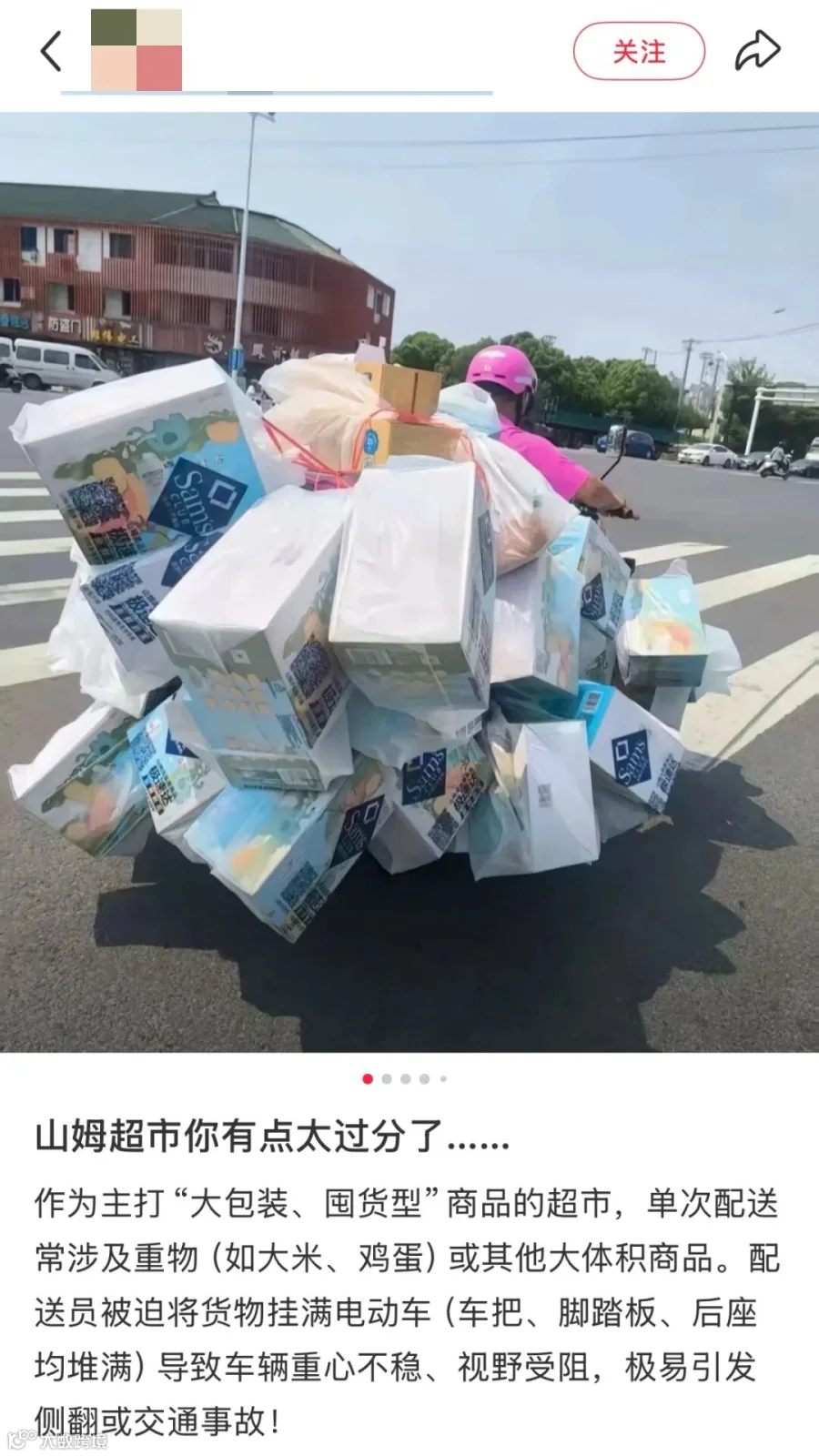 《中华人民共和国道路交通安全法实施条例》明确规定,电动自行车载物,高度从地面起不得超过1.5米,宽度左右各不得超出车把0.15米,长度前端不得超出车轮,后端不得超出车身0.3米。山姆配送的商品大多为大件货物,使用两轮电动车作为配送工具,高度、宽度、重量等多方面均明显超标,错配问题严重。现有的货物配送方式极易引发刹车失灵、车辆侧翻等事故,威胁配送员、行人以及其他车辆安全。